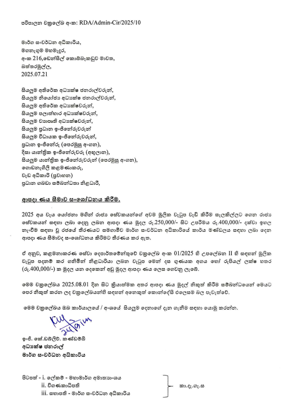 2025 අය වැය යෝජනා මගින් රාජ්ය සේවකයින්ගේ අවම මූලික වැටුප වැඩි කිරීම සැලකිල්ලට ගෙන රාජ්ය සේවකයන් සඳහා ලබා දෙනු ලබන ආපදා ණය මුදල රු. 250,000.00 සිට උපරිමය රු. 400,000.00 දක්වා ඉහල නැංවීම සඳහා වූ රාජයේ තීරණයට සමගාමීව මාර්ග සංවර්ධන අධිකාරියේ කාර්ය මණ්ඩලය සඳහා ලබා දෙන ආපදා ණය සීමාවද සංශෝධනය කිරීමට තීරණය කර ඇත.